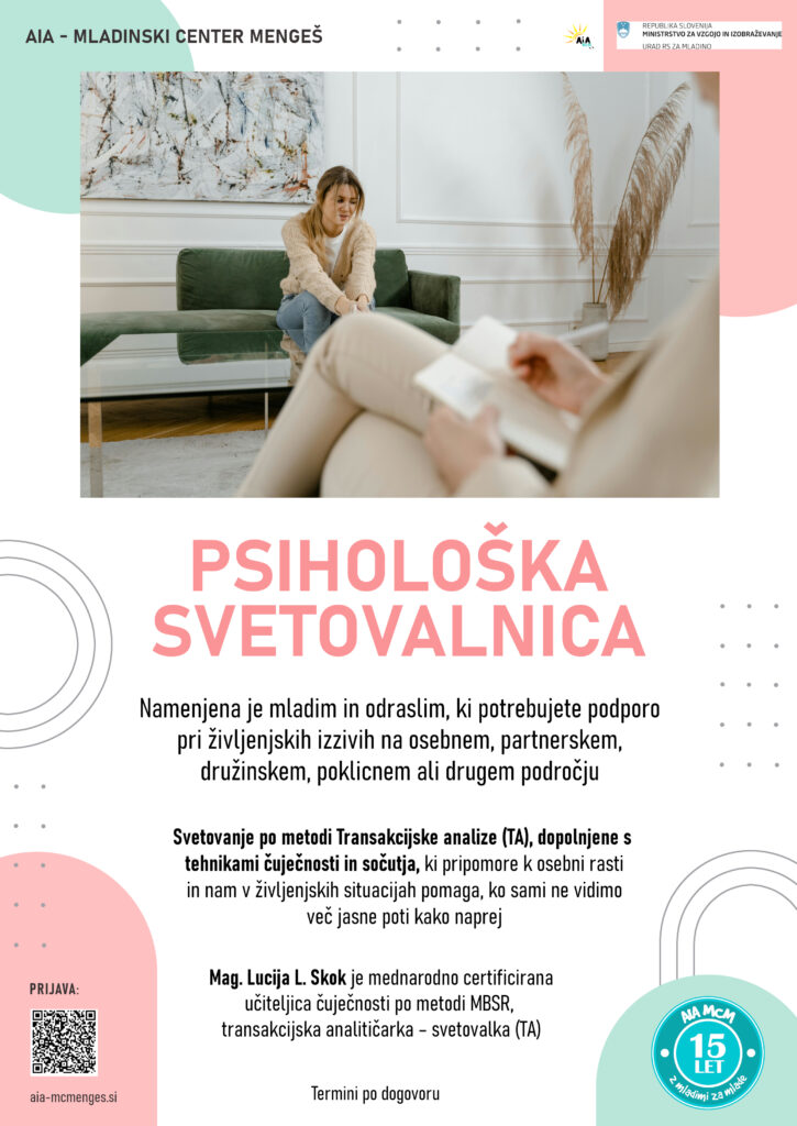 V okviru AIA – Mladinskega centra Mengeš poteka psihološka svetovalnica, ki jo vodita: mag. Lucija L. Skok, ki metode transakcijske analize dopolnjuje s tehnikami čuječe pozornosti in sočutja ter Tea Vuga, ki metode integrativne v telo usmerjene psihoterapije povezuje s tehnikami psihosocialnega svetovanja.