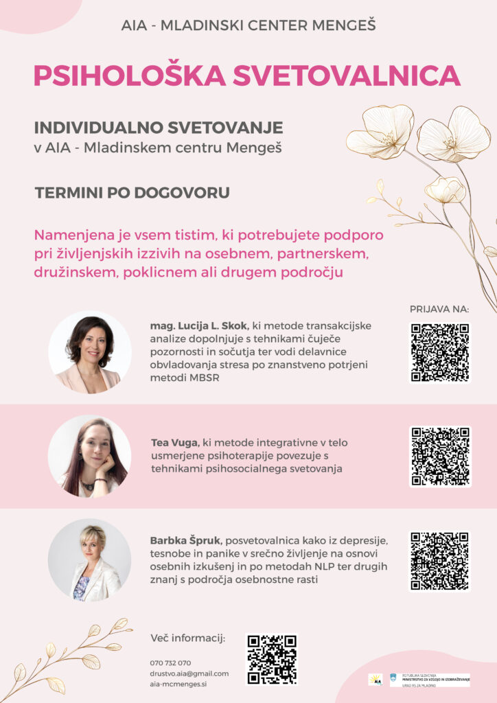 Svetovalnica bo potekala v prostorih AIA – Mladinskega centra Mengeš, Slovenska c. 28, dopoldan in popoldan – po dogovoru.